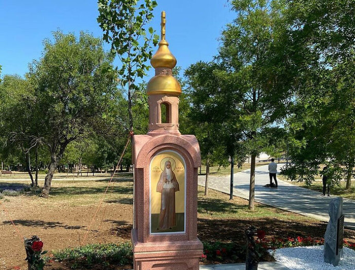 Справа от дорожки, ведущей к нему, расположен камень с именами погибших. На центральной площадке — миниатюрная часовенка из нежно-розового материала со словами молитвы ко Господу. Над нишей для свечей — образ Пресвятой Богородицы «Трилетствующая Юница». На сторонах справа и слева — иконы святых покровительниц убиенных девочек — святой Софии и преподобномученицы Елисаветы.